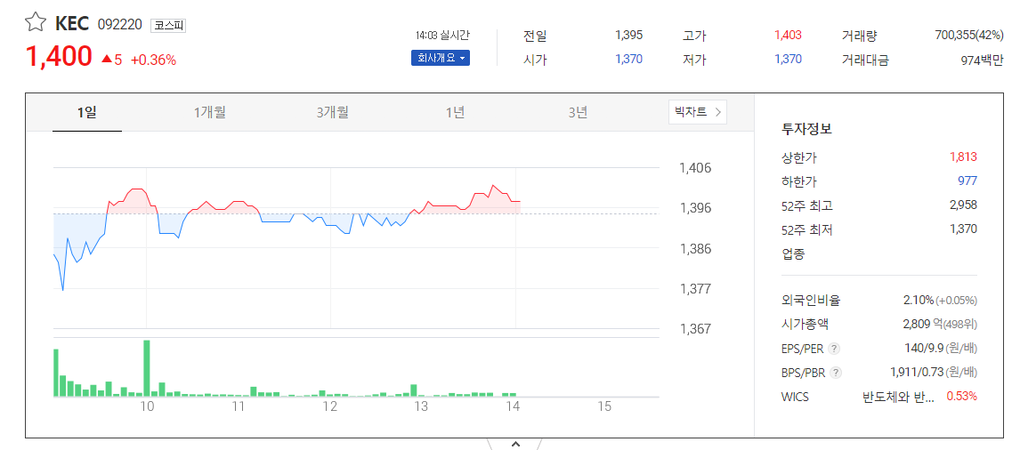 KEC는 반도체 및 관련장비 기업입니다. 대표자는 이종홍, 이태선, 강래훈이며 설립일은 2006/09/12, 주식 상장일은 2006/10/16입니다. 전체 종업원 수는 576명이고 본사 주소는 서울시 서초구 마방로 10길 5입니다.