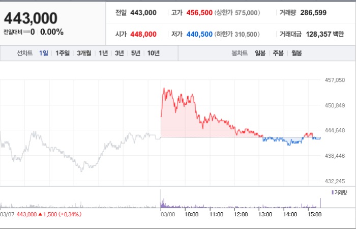 LG화학의 현재 주가는 443,000원이며 전일 대비 -4.42원의 변동을 보여주고 있습니다. 주주현황을 살펴보면 LG(외 2인)이 지분의 33.37%를 소유하고 있습니다. LG화학은 화학 기업으로, 장중 기준으로 주가는 443,000원입니다. 시가 총액은 31조2724억 원이며 발행 주식수는 70,592,343주입니다. 외국인 보유 비중은 40.36%이며, 장중 거래량은 311,412를 기록했습니다. 매출액은 421,150억 원을 달성했습니다.